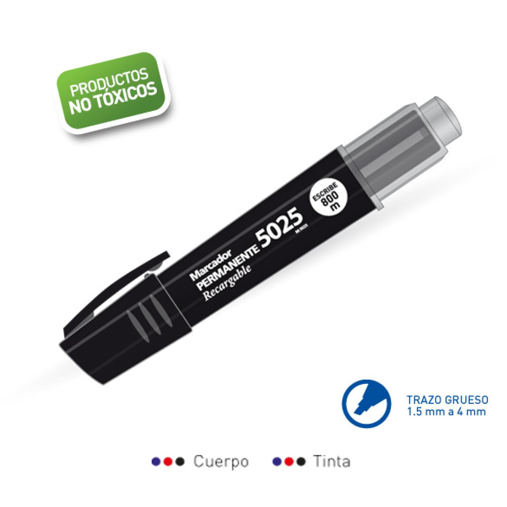 Punta biselada. Para escribir, rotular y colorear sobre cualquier tipo de superficie como metal, vidrio, plástico, etc. La tinta es de secado instantáneo, no se corre, es resistente al agua. Escribe 800 m.
