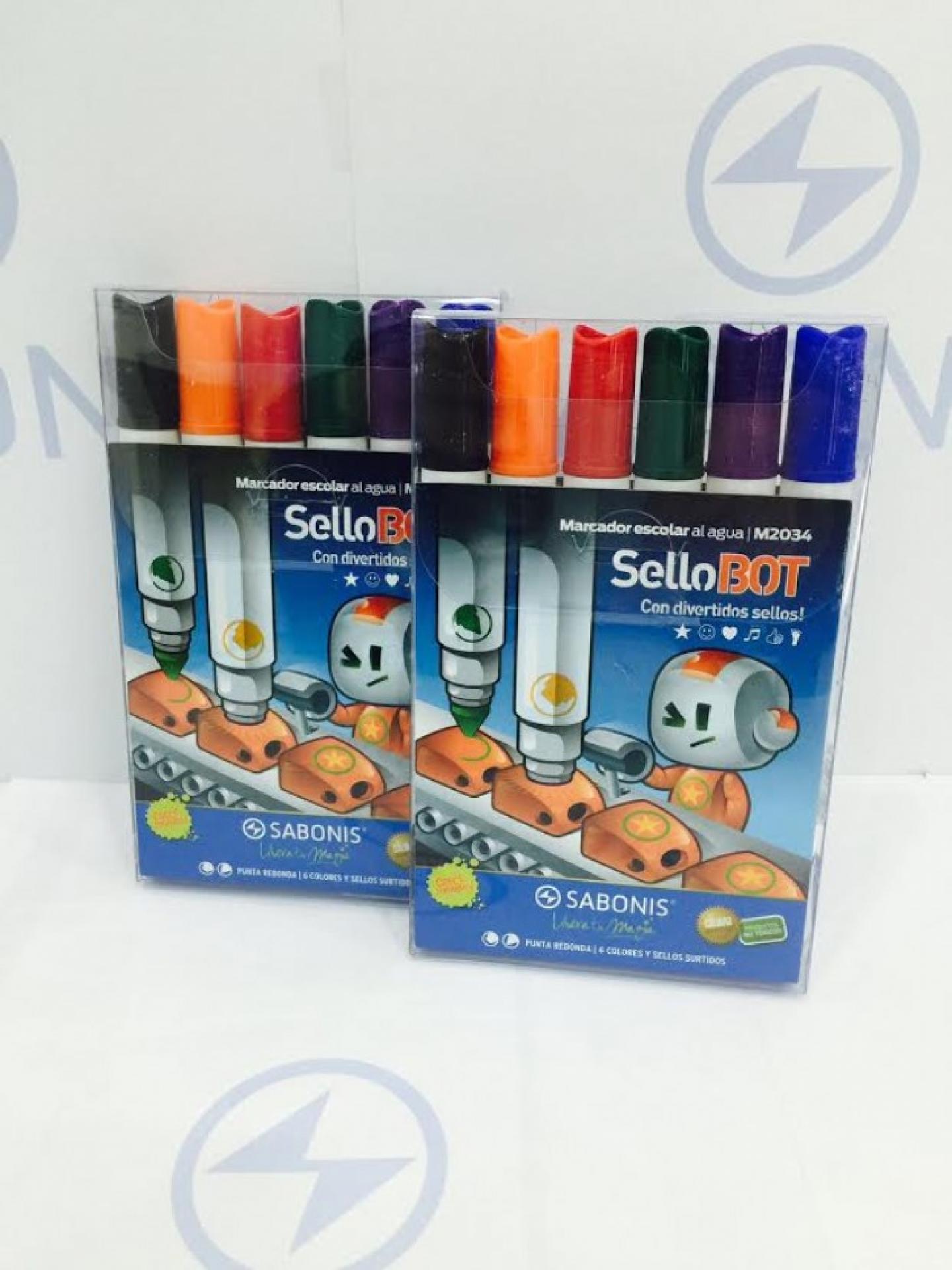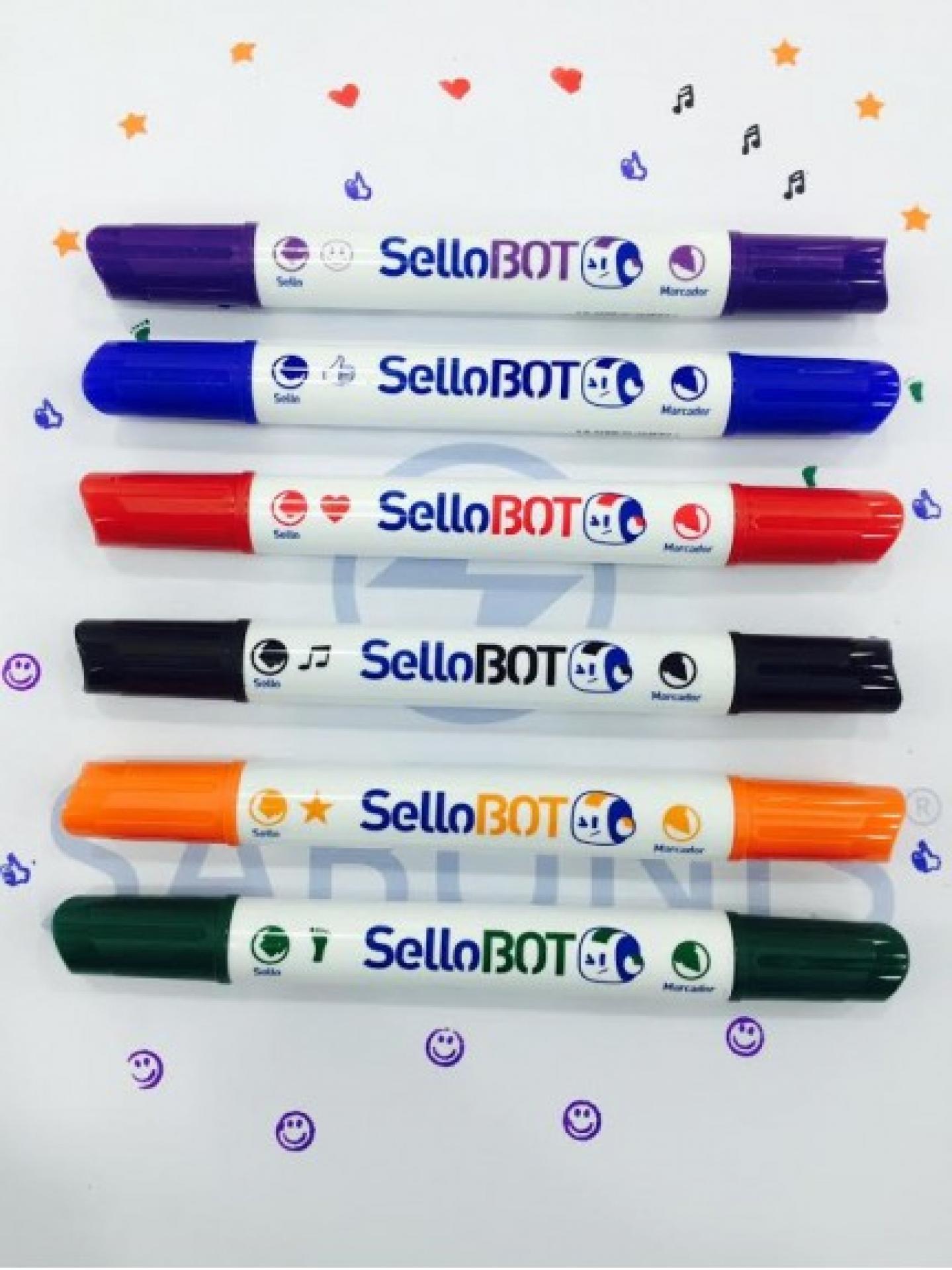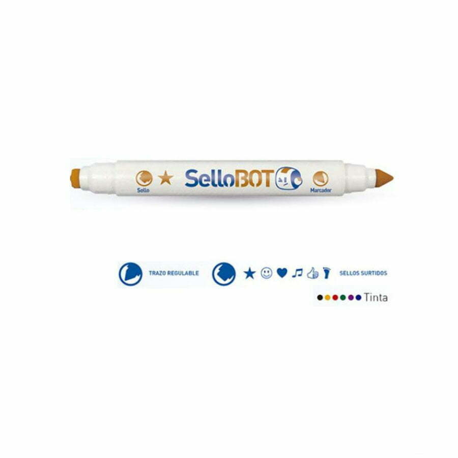 Tinta a base de agua con doble punta. Una de trazo regulable y punta redonda y la otra con diversos sellos. No tóxico y lavable.